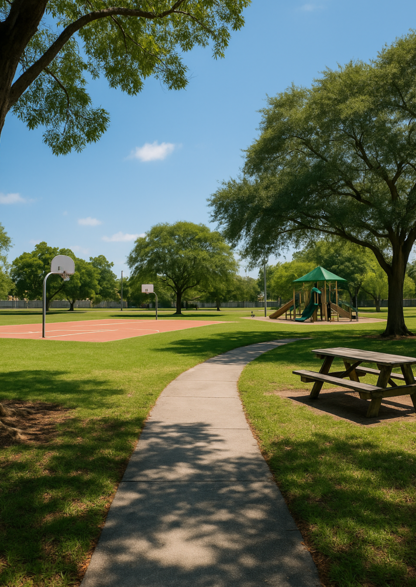 This neighborhood park has plenty of space to move around—wide-open greens, a basketball court, shaded sitting areas, and a full rec center.