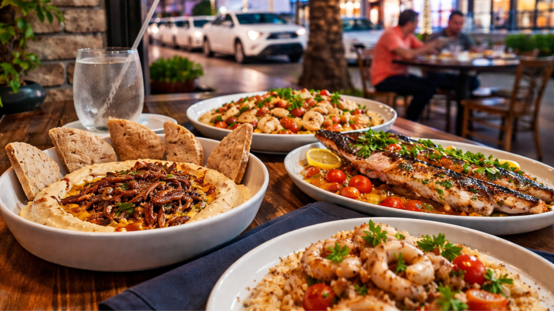 Here, your choices revolve around Mediterranean and Israeli cuisine, including classics like mezze, hummus variations, roasted vegetables, fresh crudos, seafood dishes, flatbreads, and larger plates of branzino, TLV-style seafood paella, calamari risotto, lamb lahmacun, and grilled fish — all prepared under strict Kosher standards.