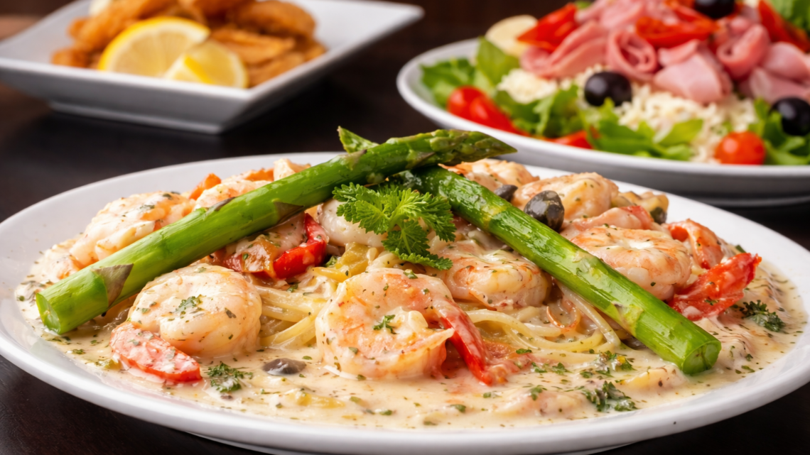 Think scratch-made favorites you'd happily order again — Beef Carpaccio, Chicken & Waffles, salads, dry-aged steaks across prime cuts, pan-seared salmon, and plenty more.
