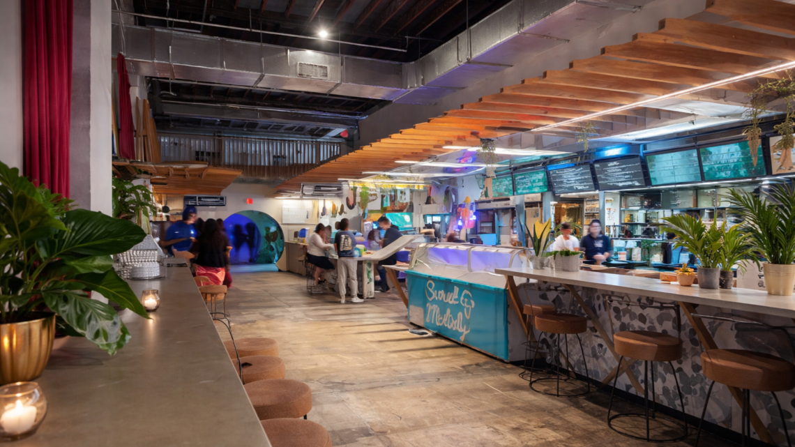 And while the food definitely outweighs the shops, the retail side is kept alive through vendor markets and pop-up shopping events (think vintage + handmade seller lineups that rotate weekly or monthly), where you can browse small-batch goods, accessories, art, and giftable finds between bites — with the rooftop scene acting as the perfect finale.